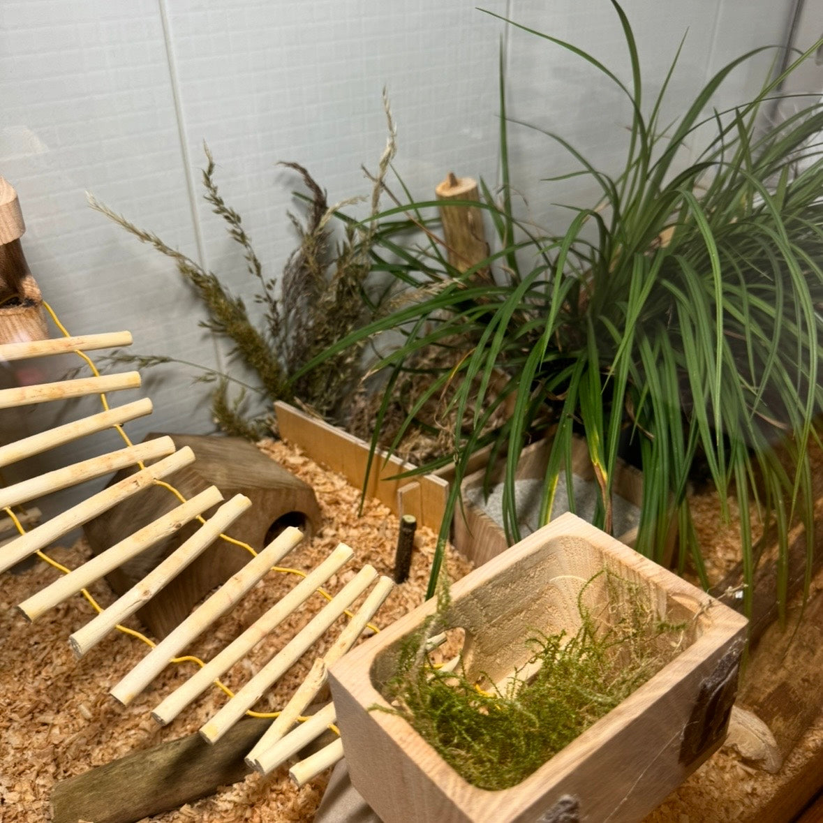 Proto v ubikaci s velkou spoustou skrýší, průlezkami a dostatečnou vrstvou podestýlky, kde se může zahrabat se bude cítit mnohem lépe.